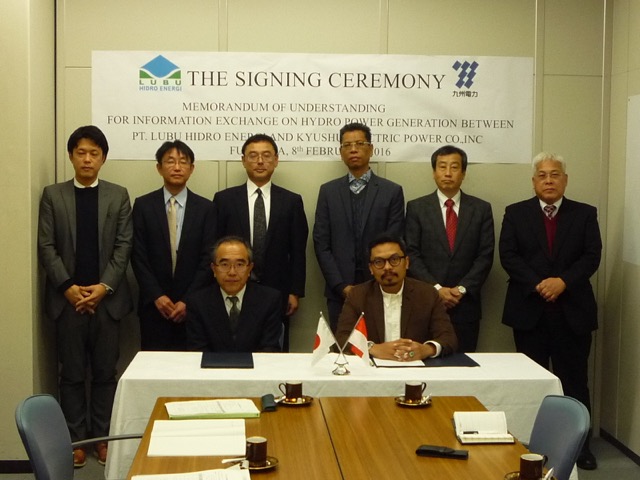 “PT. Lubu Hidro Energi (LHE) and Kyushu Electric Power CompanyInc. (KYUSHU) telah menandatangani Nota Kesepahaman untuk pertukaran informasi mengenai pembangkit listrik tenaga air pada tanggal 8 Februari 2016. Nota Kesepahaman tersebut ditandatangani di Jepang oleh Kiyomi Murakami, General Manager Divisi Engineering KYUSHU, dengan Mulyadi, Komisaris PT. LHE.